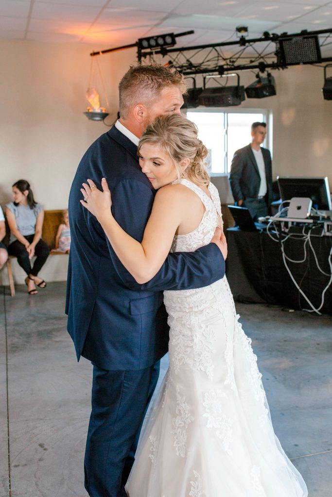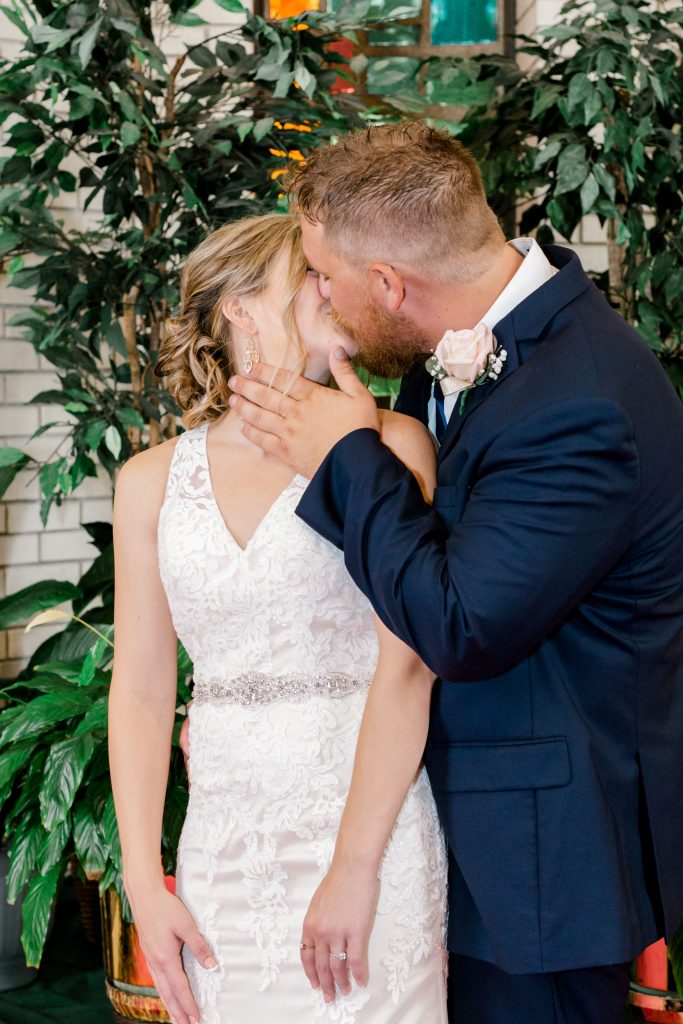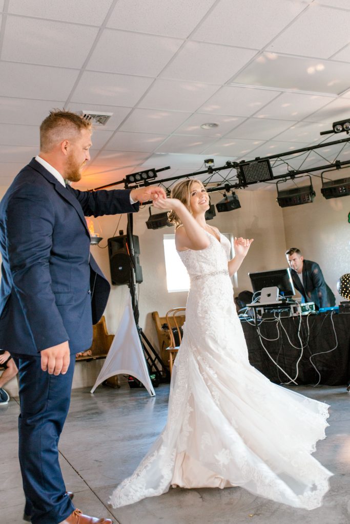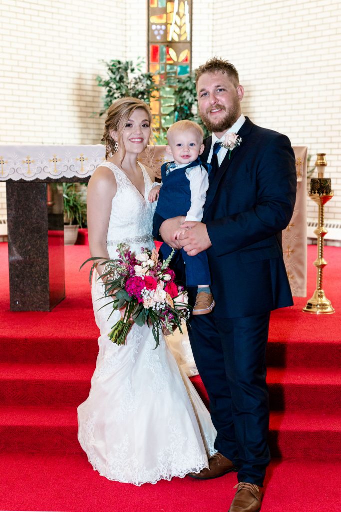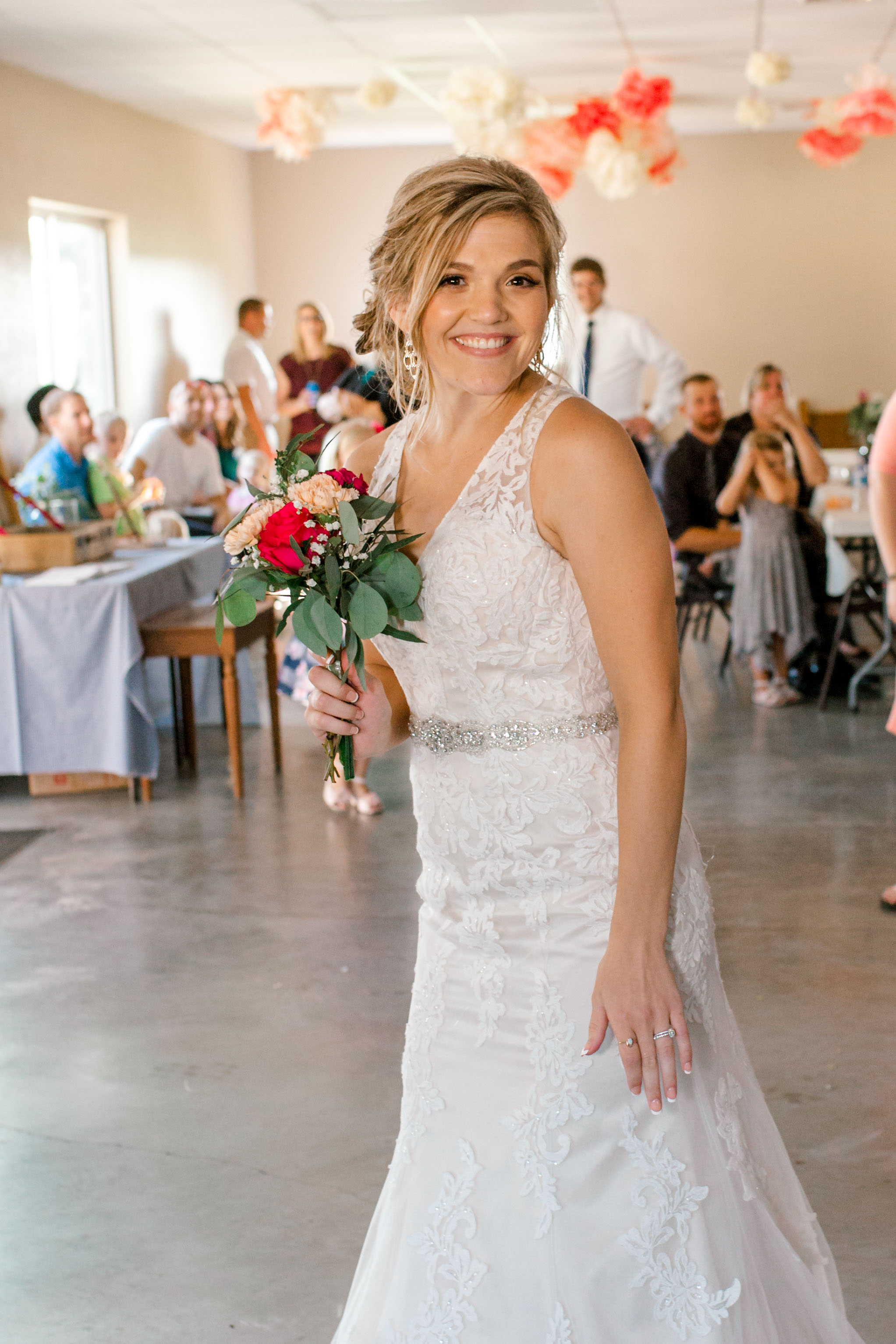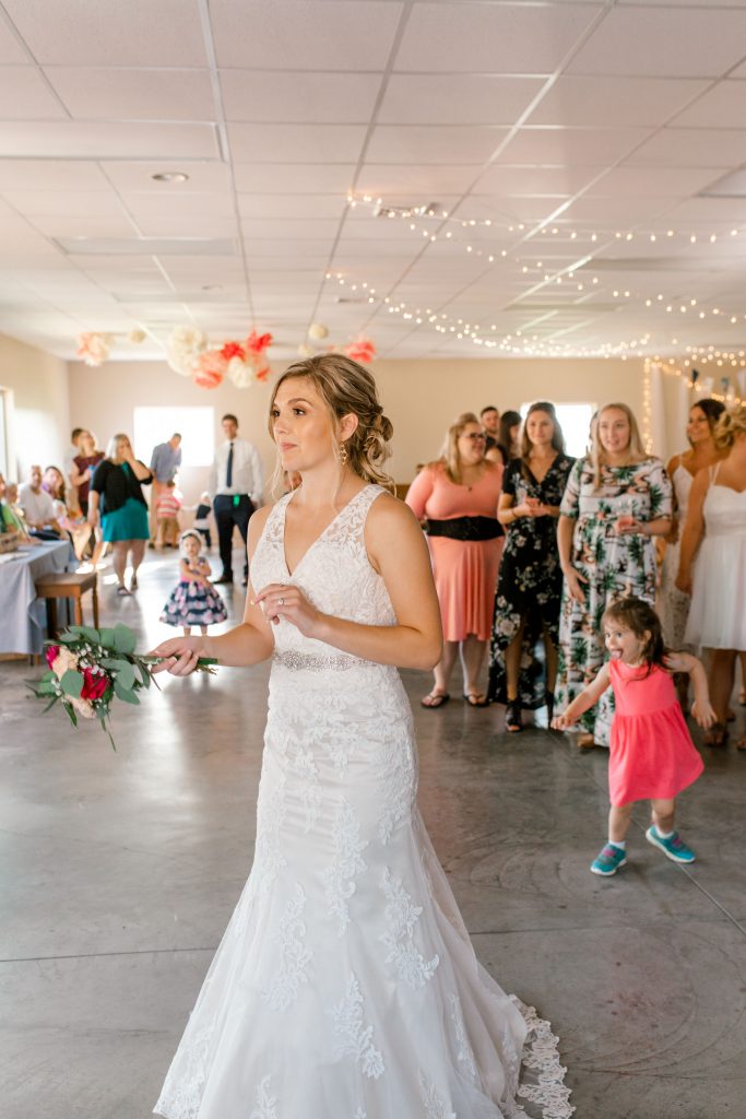 The guests started to arrive and file into the pews, whispering excitedly to each other and glancing around eagerly to catch glimpses of the couple, or perhaps a sneak peek at the bride’s dress! Music started to slowly drift from the corner, where a live singer’s voice gently filtered throughout the room. Next was a special moment for the couple: their one-year-old son Thatcher was next to go down the aisle. He held hands with the adorable flower girl, Raegan McDonald, and giggles rose up in the crowd as these two kiddos made it clear they were not sure they wanted to go down the aisle. Thankfully, with a little help from the groom’s sister Kayla, they made it. A few tears were shed and intakes of breath could be heard as Elizabeth walked arm in arm down the aisle with her father. When she reached Slater, he looked as if he never could have imagined a more beautiful person to marry. Vows were made, promises were spoken, and a big kiss sealed the deal! Elizabeth and Slater walked hand in hand back down the aisle and into the start of their beautiful marriage.