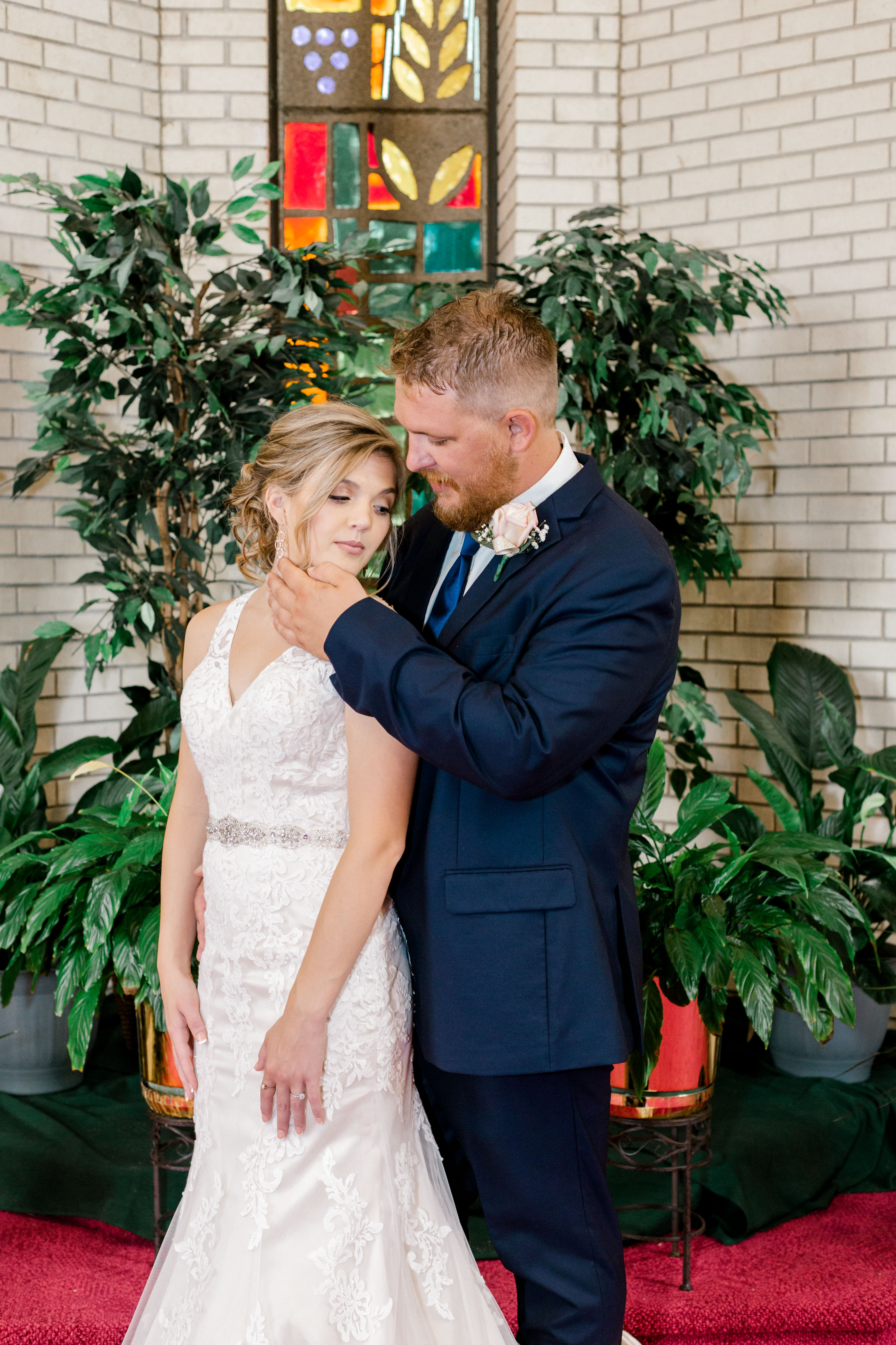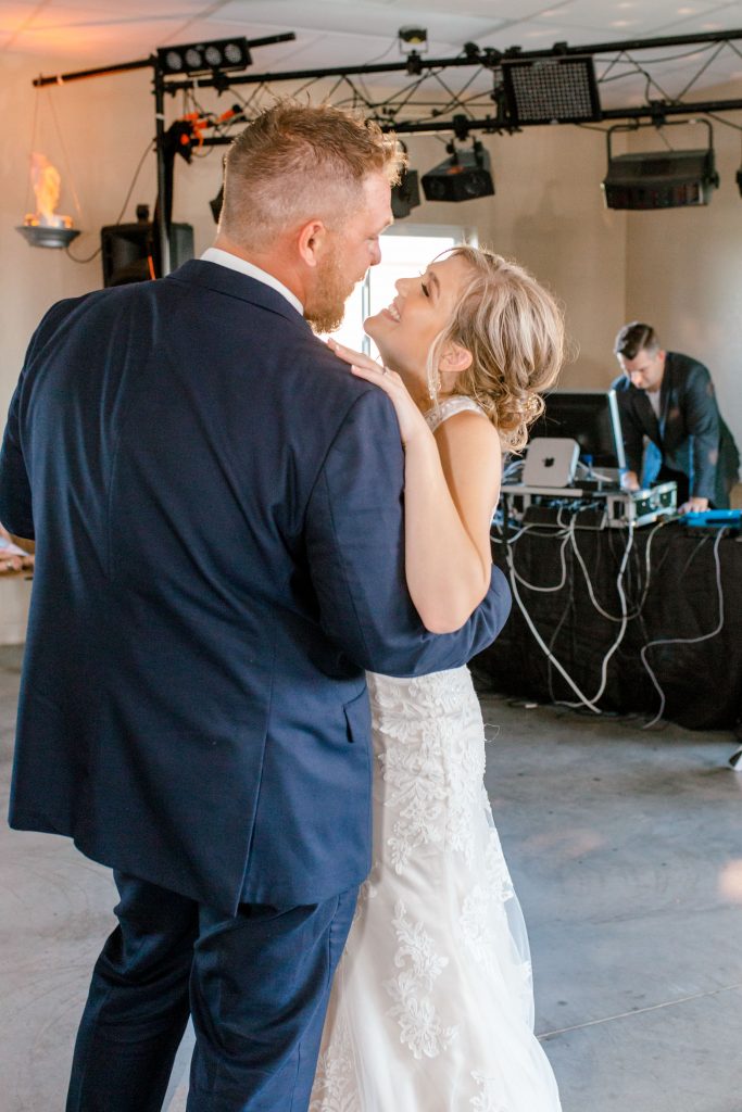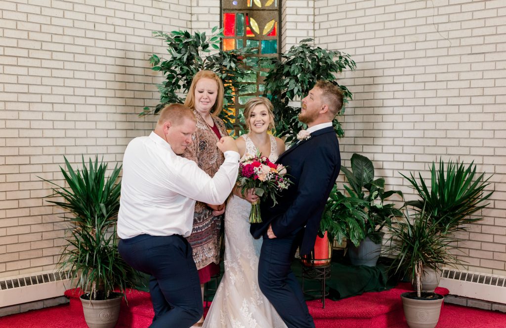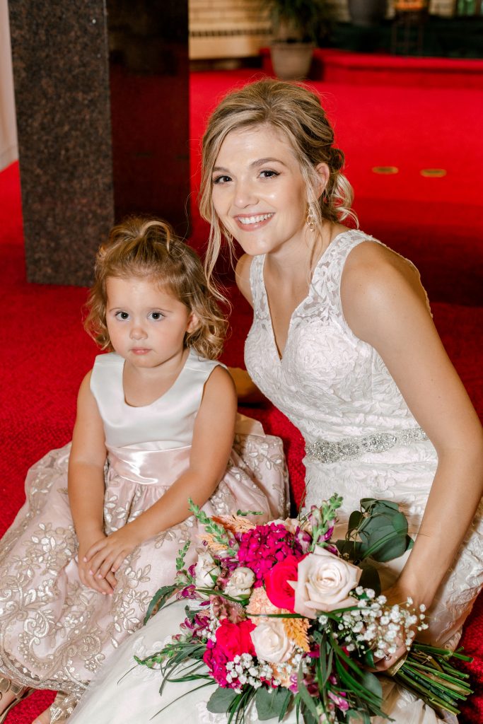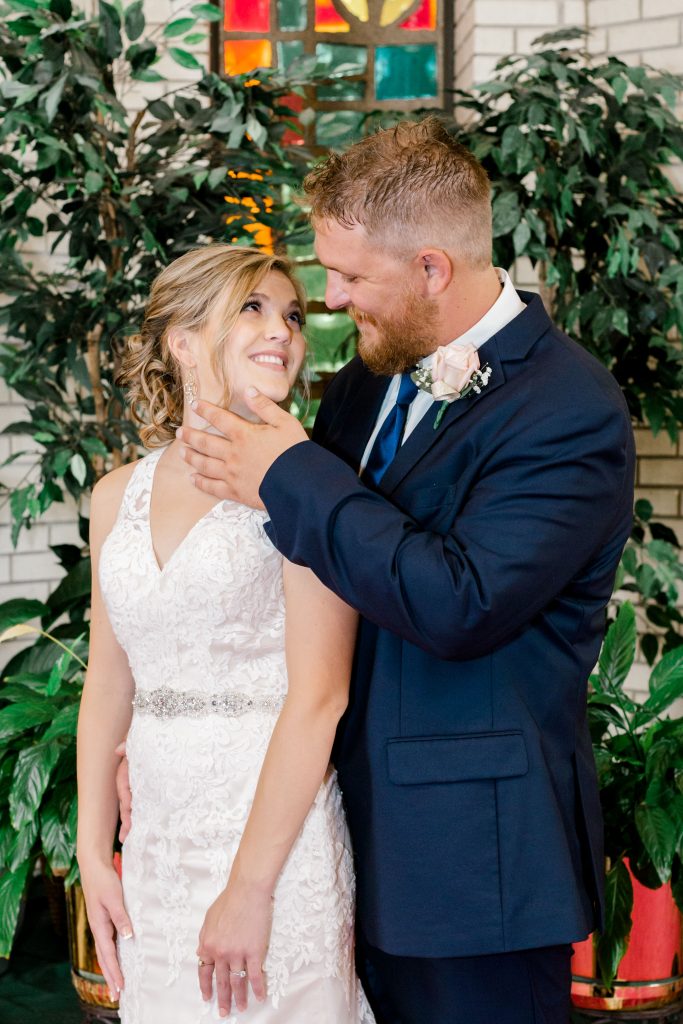 The guests started to arrive and file into the pews, whispering excitedly to each other and glancing around eagerly to catch glimpses of the couple, or perhaps a sneak peek at the bride’s dress! Music started to slowly drift from the corner, where a live singer’s voice gently filtered throughout the room. Next was a special moment for the couple: their one-year-old son Thatcher was next to go down the aisle. He held hands with the adorable flower girl, Raegan McDonald, and giggles rose up in the crowd as these two kiddos made it clear they were not sure they wanted to go down the aisle. Thankfully, with a little help from the groom’s sister Kayla, they made it. A few tears were shed and intakes of breath could be heard as Elizabeth walked arm in arm down the aisle with her father. When she reached Slater, he looked as if he never could have imagined a more beautiful person to marry. Vows were made, promises were spoken, and a big kiss sealed the deal! Elizabeth and Slater walked hand in hand back down the aisle and into the start of their beautiful marriage.