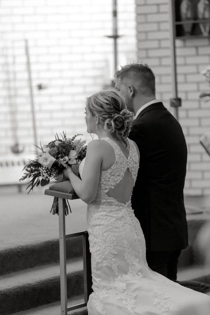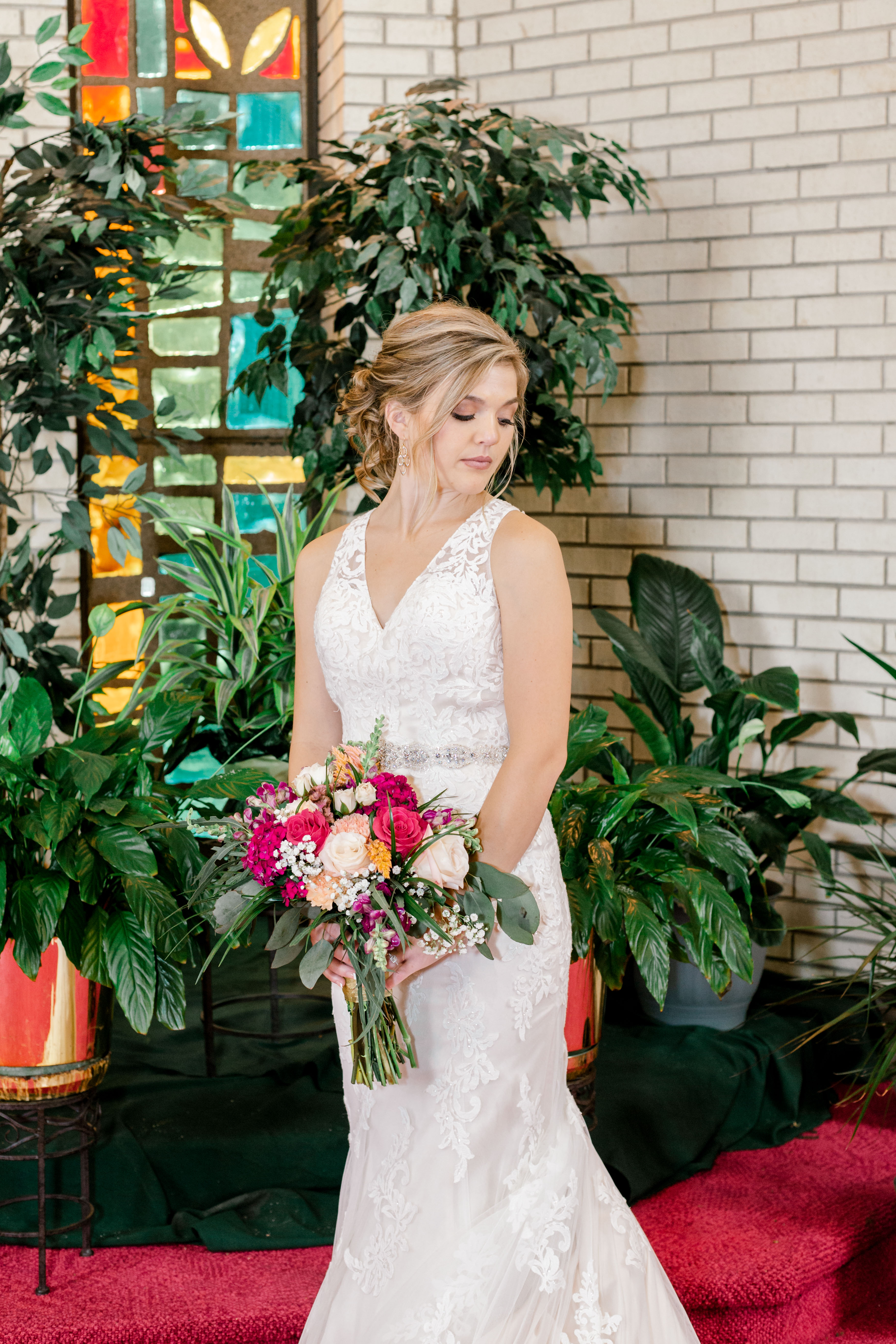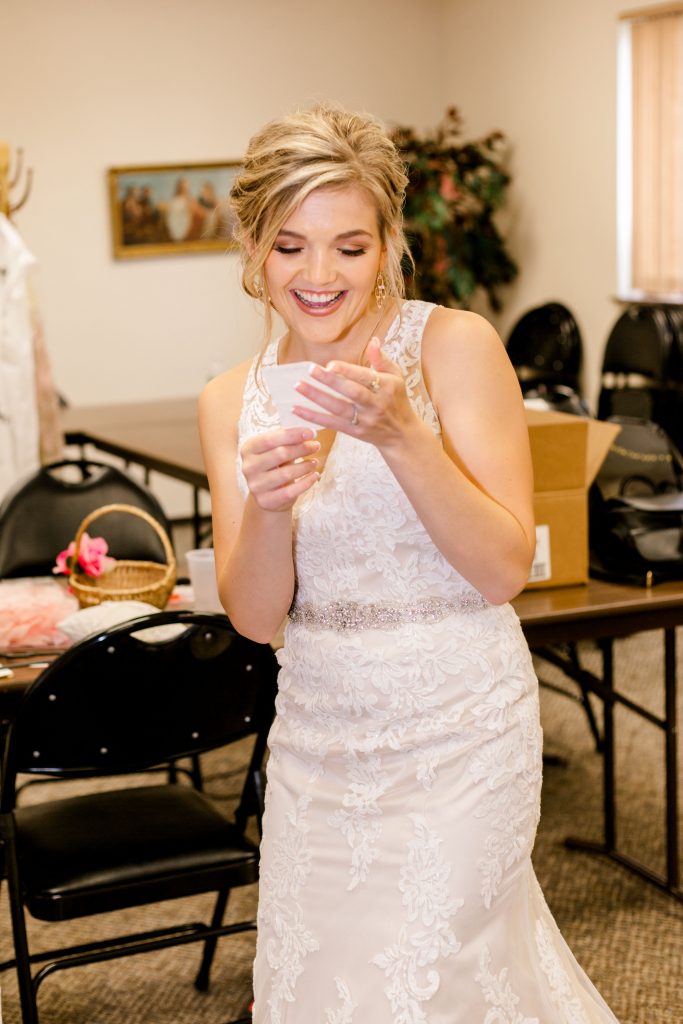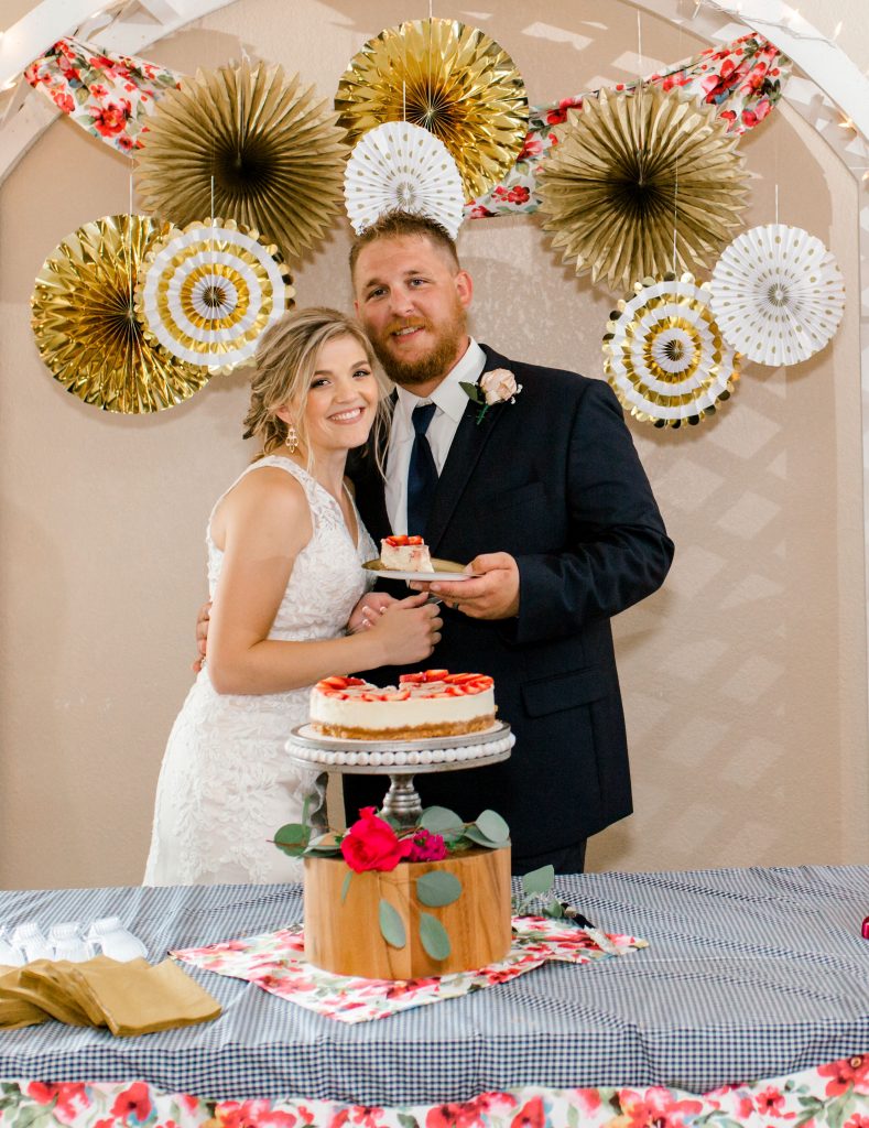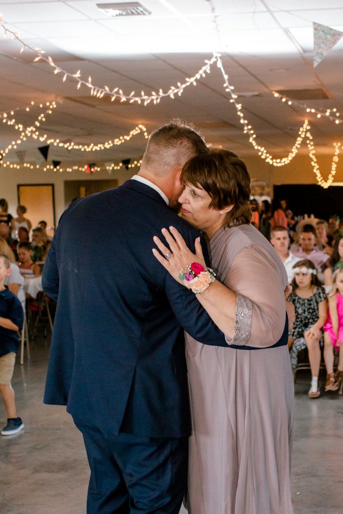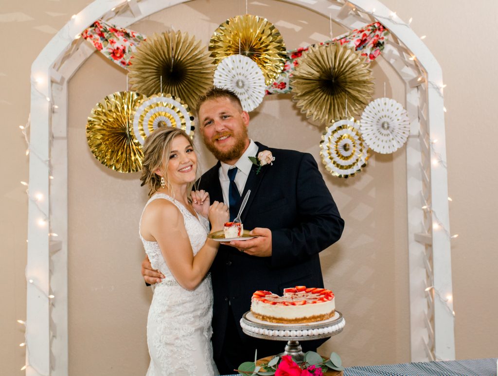 The guests started to arrive and file into the pews, whispering excitedly to each other and glancing around eagerly to catch glimpses of the couple, or perhaps a sneak peek at the bride’s dress! Music started to slowly drift from the corner, where a live singer’s voice gently filtered throughout the room. Next was a special moment for the couple: their one-year-old son Thatcher was next to go down the aisle. He held hands with the adorable flower girl, Raegan McDonald, and giggles rose up in the crowd as these two kiddos made it clear they were not sure they wanted to go down the aisle. Thankfully, with a little help from the groom’s sister Kayla, they made it. A few tears were shed and intakes of breath could be heard as Elizabeth walked arm in arm down the aisle with her father. When she reached Slater, he looked as if he never could have imagined a more beautiful person to marry. Vows were made, promises were spoken, and a big kiss sealed the deal! Elizabeth and Slater walked hand in hand back down the aisle and into the start of their beautiful marriage.