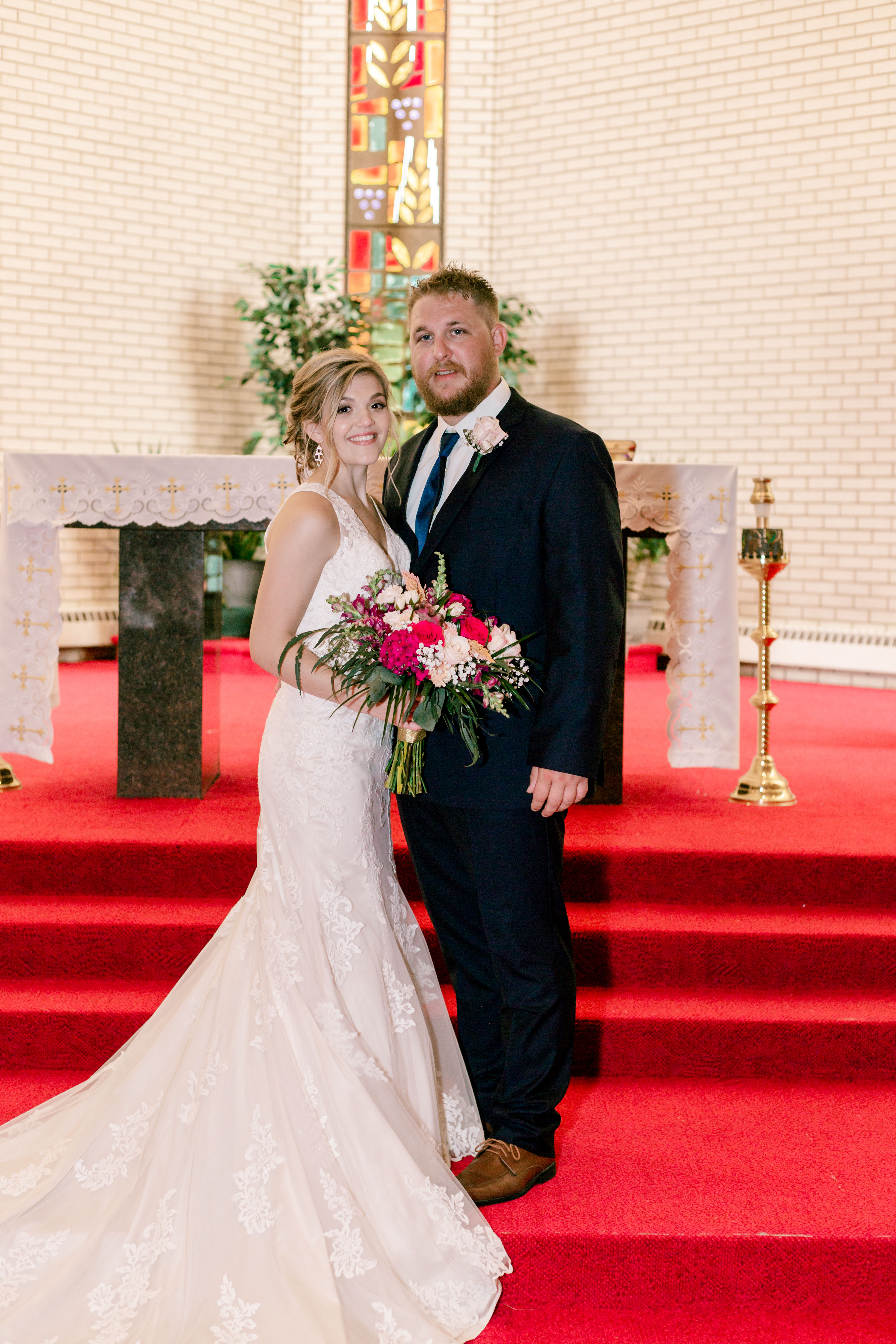 The bride began the prepping with hair at Just Teasin’. Erica and Brittany made sure that Elizabeth’s hair was all she was hoping it to be, and it was gorgeous: a cascade of curls pinned back to create a soft, timeless look. Off to St. Mary’s Church for makeup artist Lexi Post to do her makeup and by the end, Elizabeth walked away a glowing, excited bride!