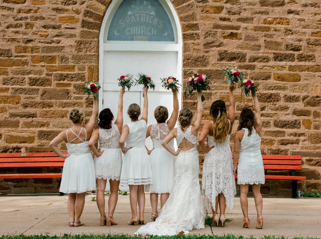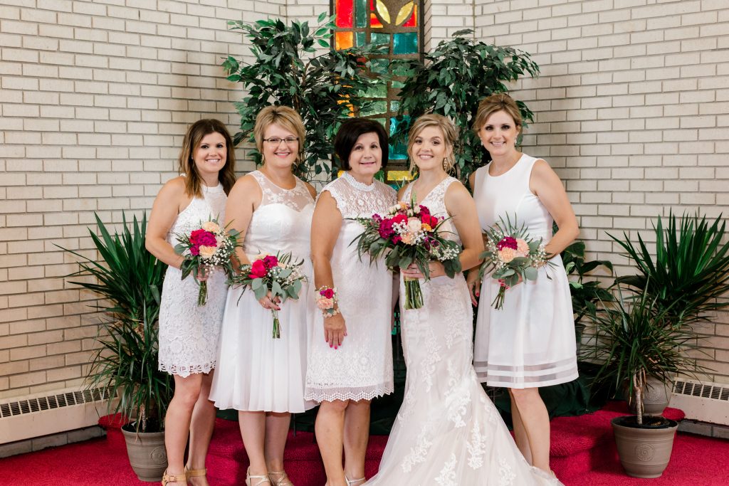 The wedding parties met – gals and guys in different rooms, of course – to slip into their own dresses and suits, and to laugh and bask in the anticipation of the day to come. Gorgeous flowers in colors of whites, soft pinks, and reds had already arrived from Mike’s Blooms and Things, and these were pinned into place and given to the bridesmaids to hold. Elizabeth took a moment for herself to shimmy into her wedding dress, a breathtaking gown of lace and jewels. Heels were slipped on, and suddenly everything had come together. Elizabeth was ready to marry her best friend.
